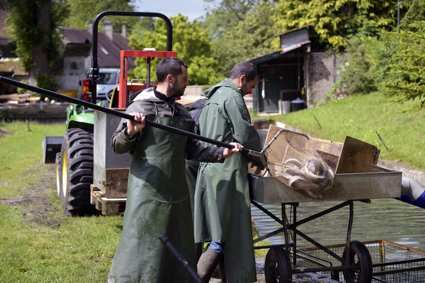 Régulièrement nous calibrons à la main nos pensionnaires. Les plus grosses truites sont alors transférées vers les bassins de vente, et les plus petites continuent de grossir tranquillement.Comme nous n’utilisons pas de médicaments, ce tri manuel permet également de veiller de près à l’état de santé des poissons. La moindre maladie induit l’isolement voire l’élimination du poisson : il s’agit d’une veille préventive.
